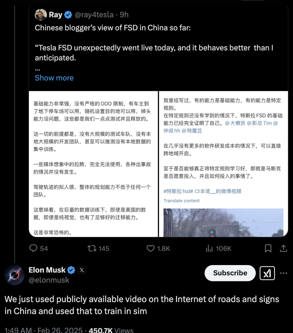 值得注意的是,25日当天特斯拉中国推送驾驶辅助功能软件更新,马斯克在社交平台X上回应称,特斯拉只是使用了互联网上公开的中国道路和标志的视频,并用这些数据来训练模拟。