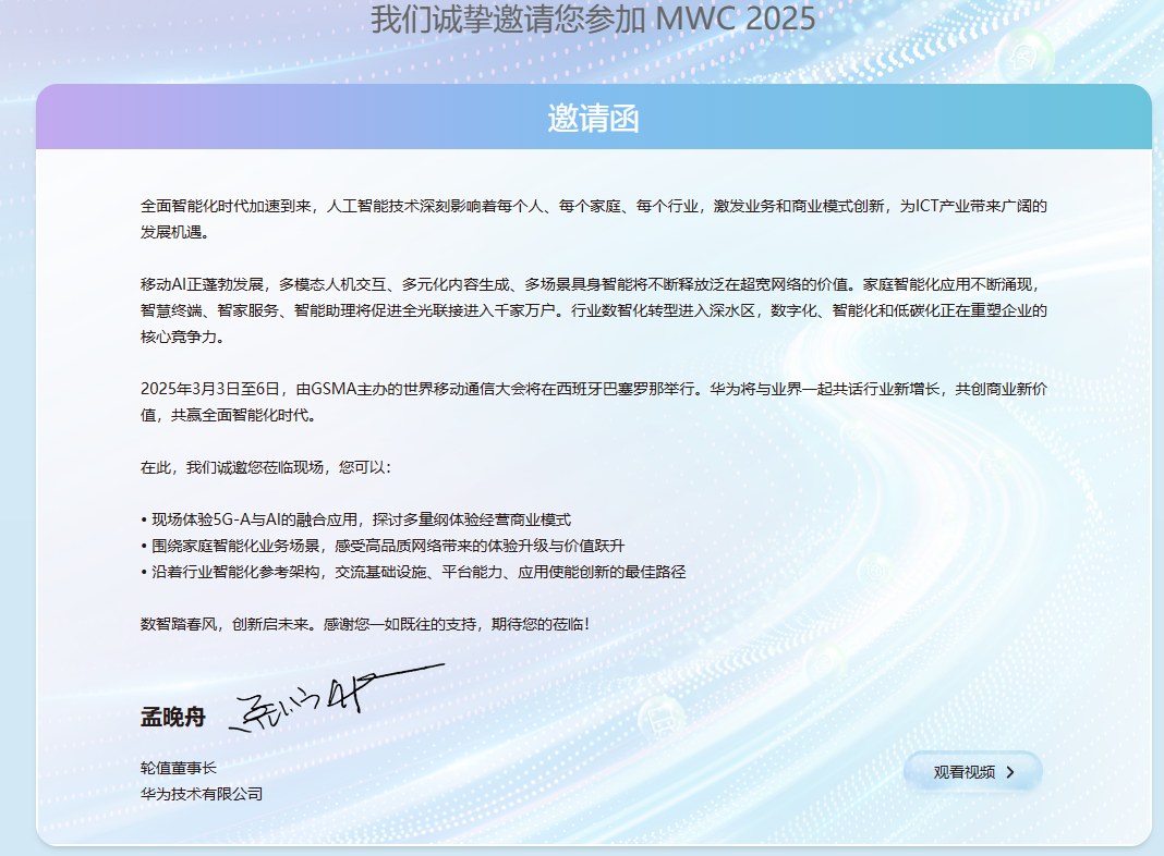 华为,作为一家通信行业的龙头企业,每年MWC期间华为的展台面积,展品的丰富程度都是首屈一指,华为的技术创新也是通信行业尤其值得关注的重点。近日,华为轮值董事长孟晚舟也发出邀请函。她写道:“移动AI正蓬勃发展,多模态人机交互、多元化内容生成、多场景具身智能将不断释放泛在超宽网络的价值。家庭智能化应用不断涌现,智慧终端、智家服务、智能助理将促进全光联接进入千家万户。行业数智化转型进入深水区,数字化、智能化和低碳化正在重塑企业的核心竞争力。”